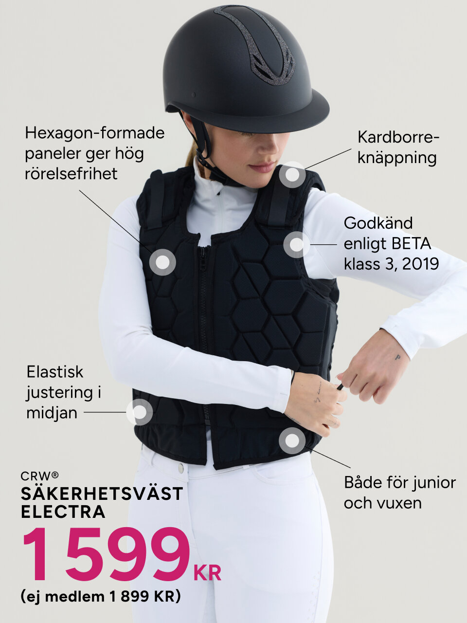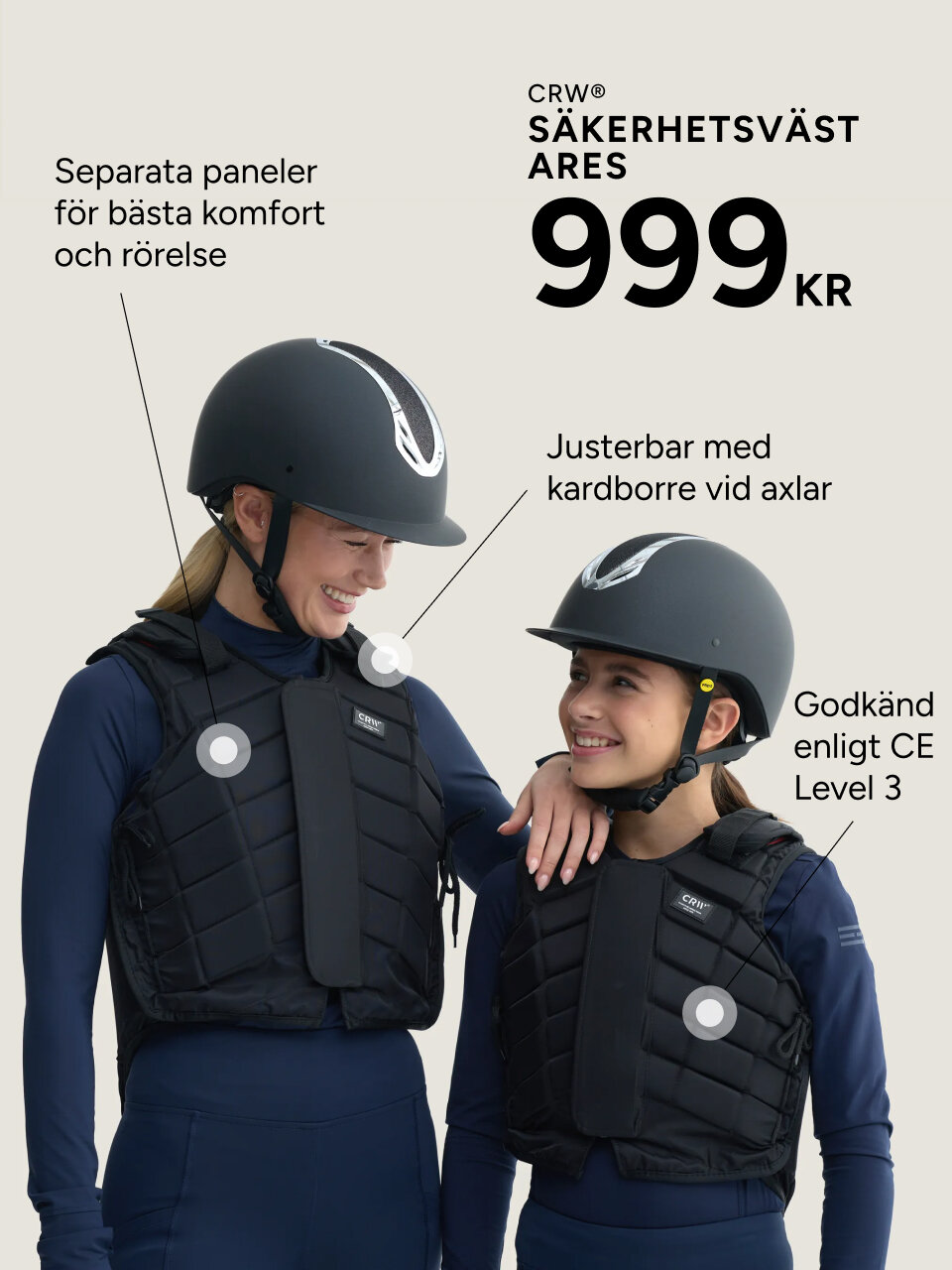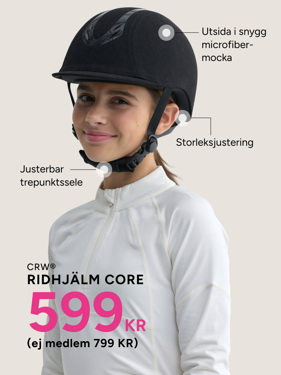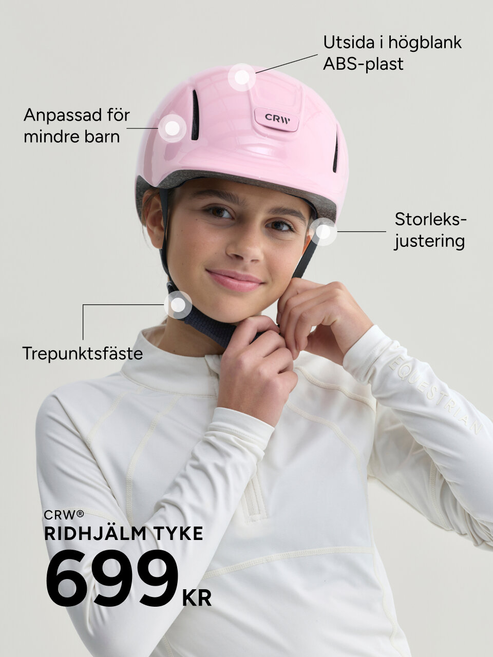 En ridhjälm är din viktigaste säkerhetsutrustning. Den ska sitta stadigt, bekvämt och rätt placerad – säkerheten går alltid först.