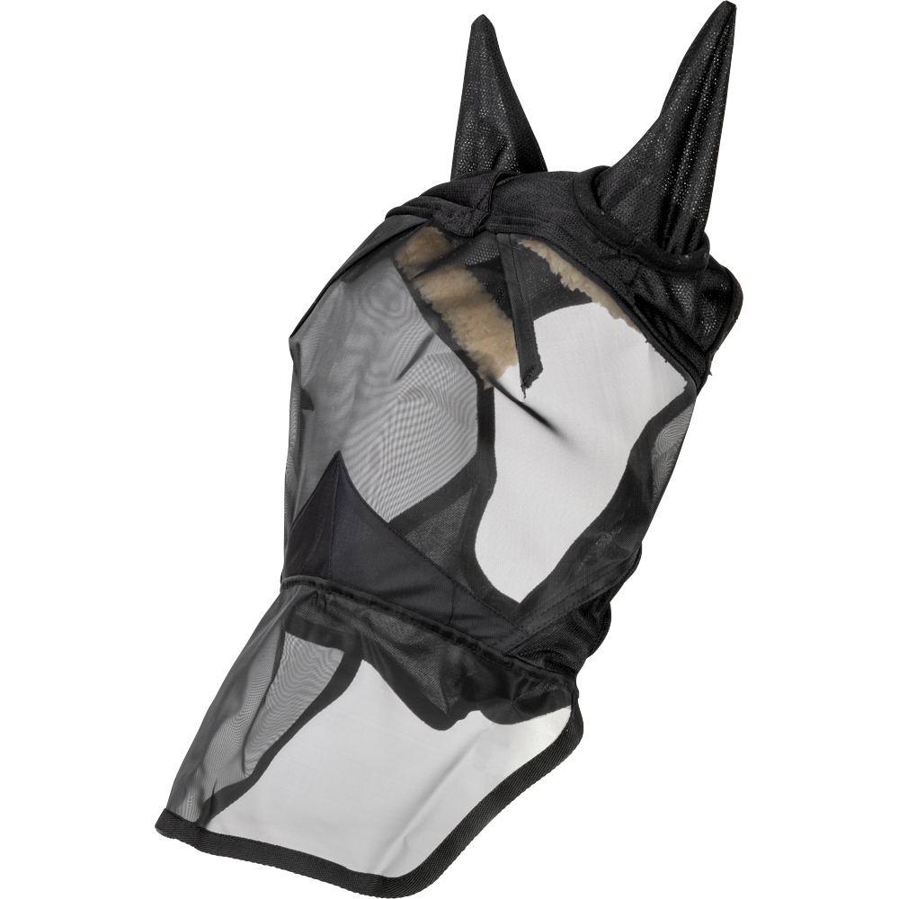 Heltäckande flughuva som skyddar de känsliga ögonen och öronen på hästen, ger dessutom skydd över nosen. Hål för pannluggen. Mjuka material som andas.