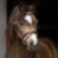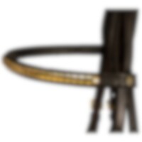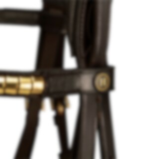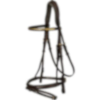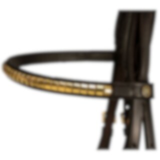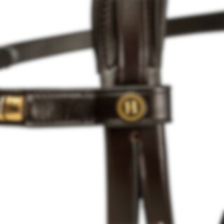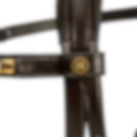 Aachenträns i europeiskt läder. Mjukt foder på nosgrimma och nackstycke. Svängt brett nackstycke där nosgrimmans rem träs utanpå. Pannband dekorerat med mässingsfärgade clincher.