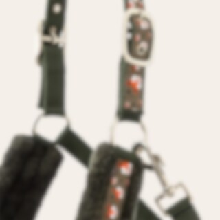 Grimma med mjuk minkfleece vid nacke, nos och sidostycken. Ställbar på båda sidor av nacken och under nos. Band dekorerat med rävar, matchar Crevan täcke art. nr. 600673.