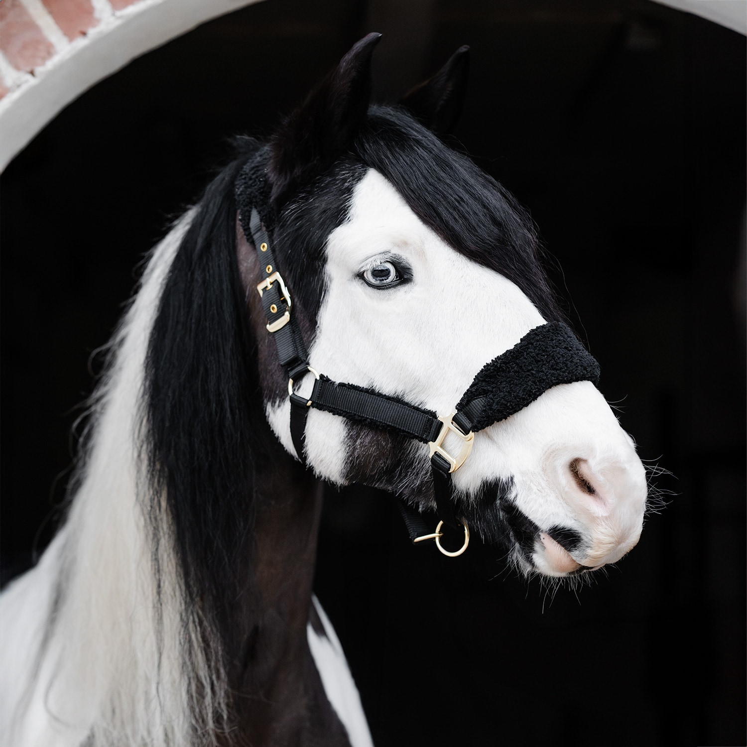 Grimma med mjuk pilé vid nos, nacke och de ställbara sidostyckena. Guldfärgade spännen.