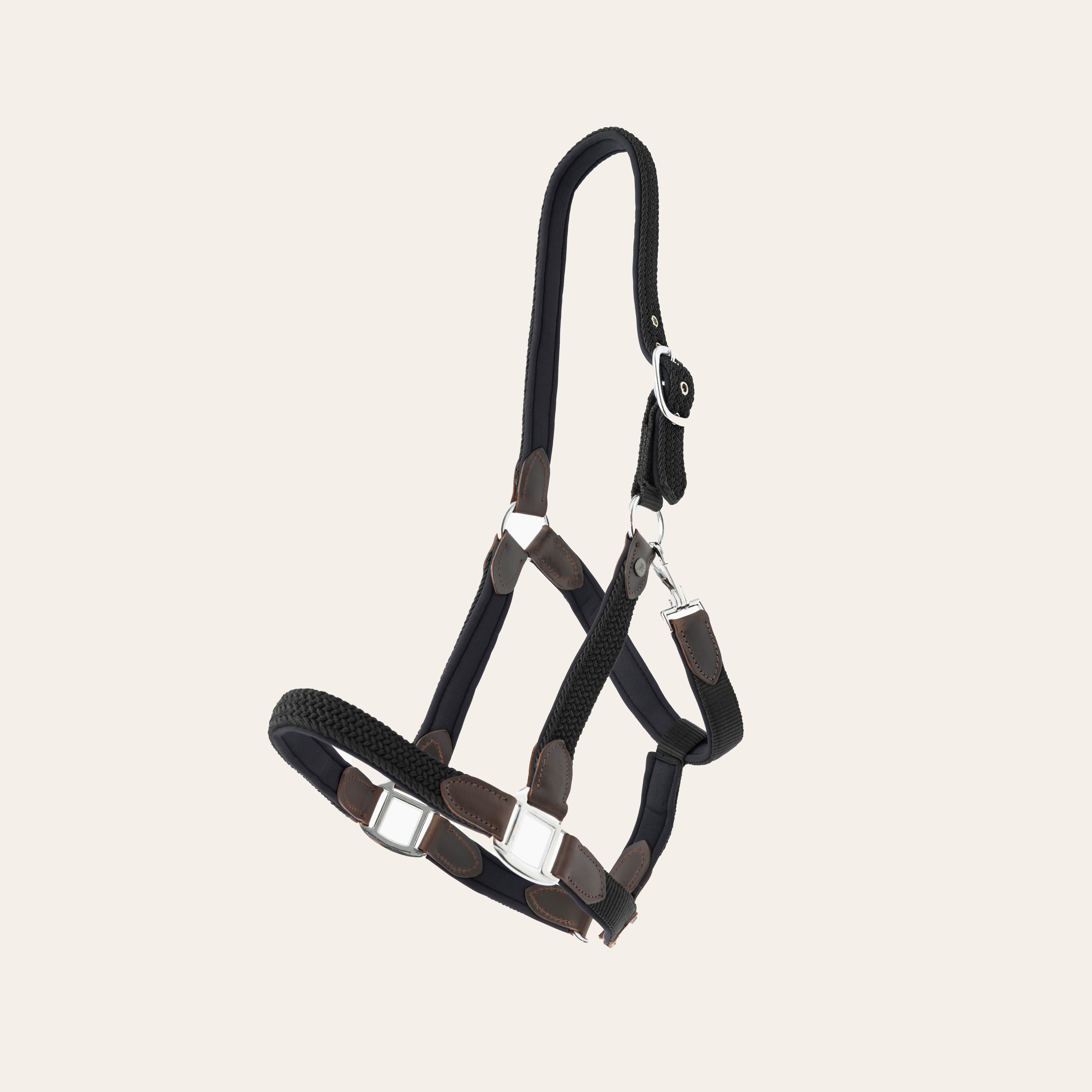 Grimma med läderdetaljer. Helfodrad med mjuk neopren. Något stretchig i nacke och nos. Matta silverfägade spännen.