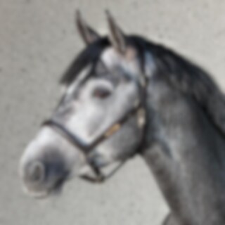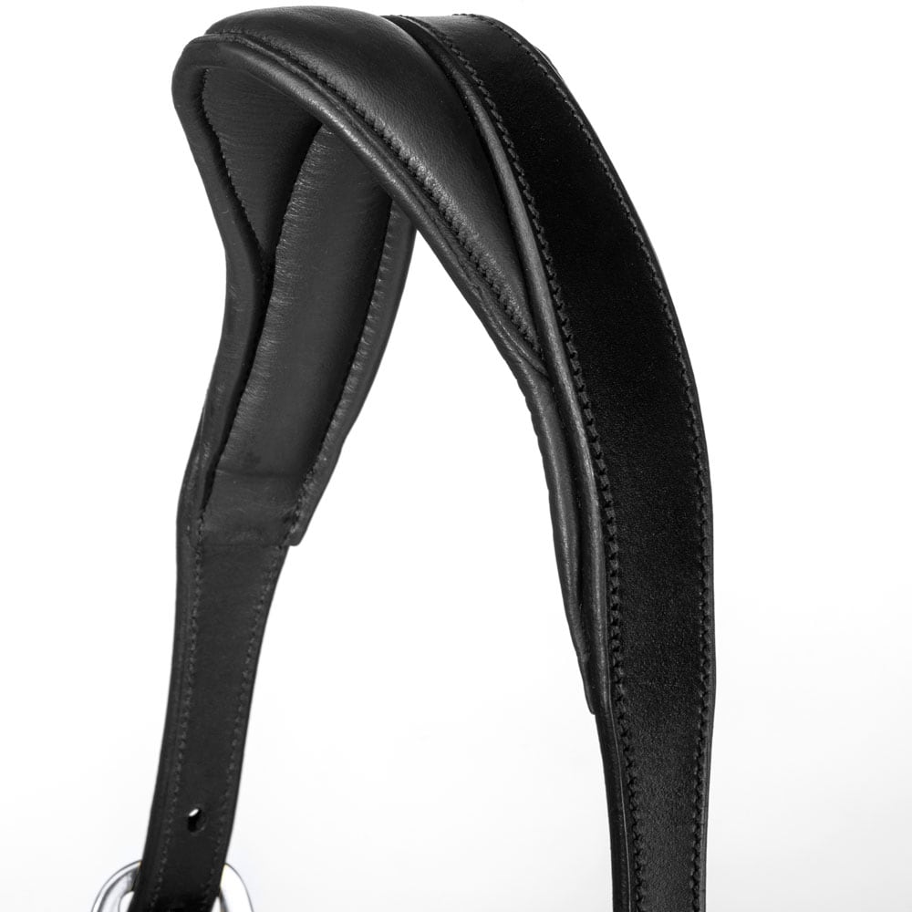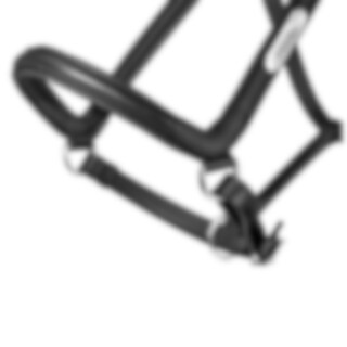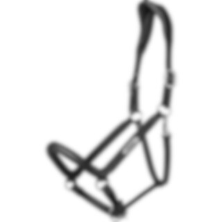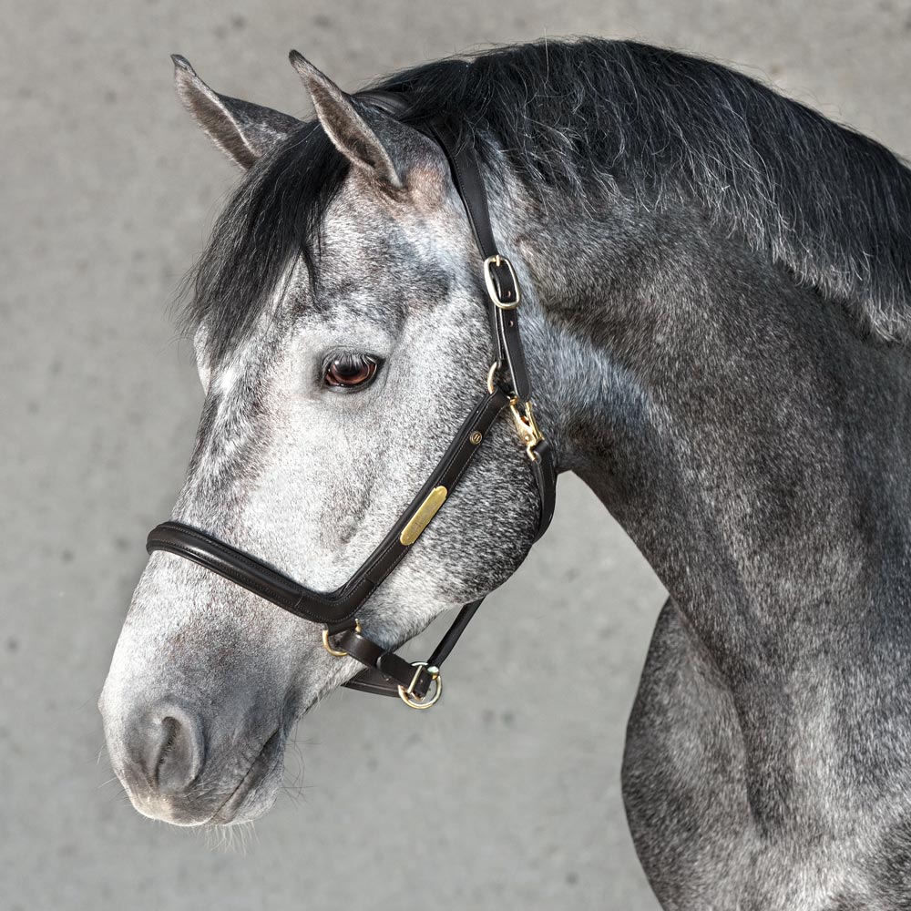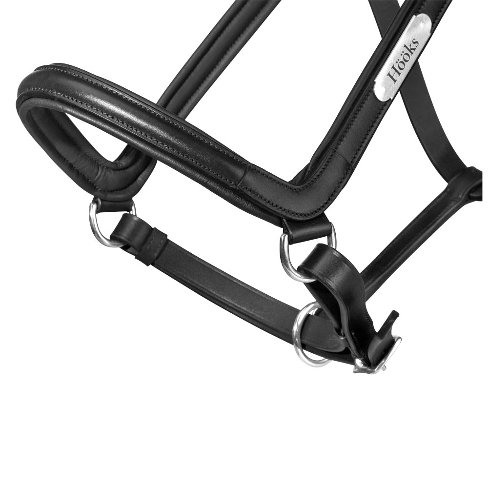 Lädergrimma med brett, mjukt anatomiskt format nackstycke. Mjukt foder i nos och sidostycken. Namnplatta med HÖÖKS, spännen på båda sidor om nacken och justerbar under nosen.