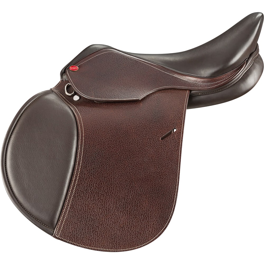 Flatbacksadel i amerikanskt läder designad för att passa juniorer och ponnyryttare. Permanent stoppade bossor med bred anläggningsyta. Mjukt, slätt skinn i säte samt på knävulster och på kåporna ett mer slitstarkt präglat läder. Utbytbara koppjärn (320538). Levereras med koppjärn i stl: Normal.