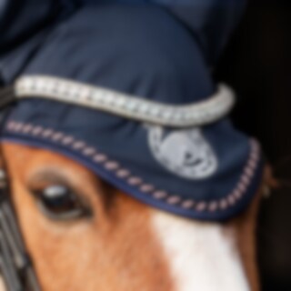 Mjuk smidig huva i stretching 100% polyester. Skyddar mot insekter, kan vid behov kompletteras med soundless ilägg för att skydda mot ljud. Dekorerad med silkes passpoal, glitter kantband och glitter brodyr.