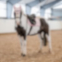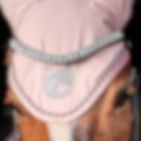 Mjuk smidig huva i stretching 100% polyester. Skyddar mot insekter, kan vid behov kompletteras med soundless ilägg för att skydda mot ljud. Dekorerad med silkes passpoal, glitter kantband och glitter brodyr.