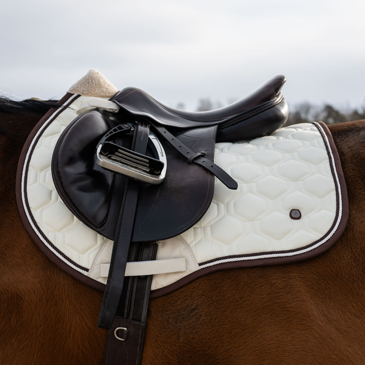 Quiltat schabrak med utsida i slitstark polyester/bomullstwill. Kraftig kombinationspadding i 300g polyfill + 1cm foam ger ett stadigt schabrak som håller formen och ligger på plats. Insida i 100% polyester funktionsmaterial som hjälper till att transportera bort fukt ifrån hästen. Teddyfodrat vid manken för att motverka skav samt panel i 3D mesh längst ryggraden för att ge ökad ventilation. Extra förstärkt vid sadelgjorden för ökad slitstyrka och korta stroppar för fäste i sadelns d-ring gör att schabraket passar till de flesta sadlarna. Dekorerat med två silkespasspoaler och logga i metall.