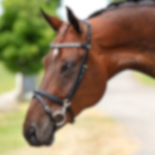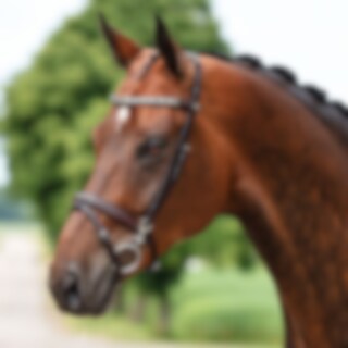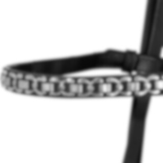 Aachenträns med hakar vid bettringen, sidostycken ställbar på nacken.Pannband med silverfärgad länk. Utan käkrem.