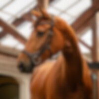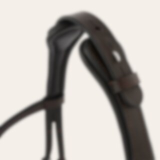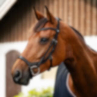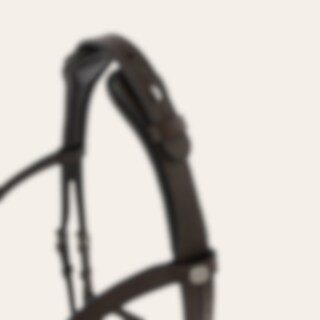 Träns med svängd nosgrimma och delat nackstycke med mjuk padding och ställbar rem. Svängt pannband och tygelhakar. Utan käkrem. Något tätare hål på sidostycken för lättare finjustering av höjden på bettet.