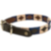 Hundhalsband i följsamt och slitstarkt läder som bara blir mjukare och mer bekvämt med tiden. Dekorerat med klassiskt lindat mönster i vaxad tråd. Spännen och d-ring i mässing.