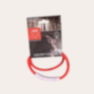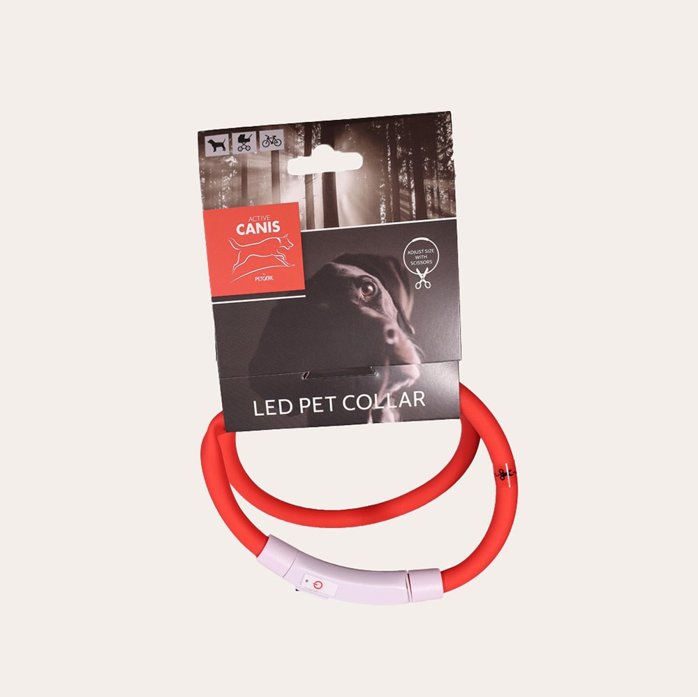 LED-halsband som lyser med tre olika ljuslägen: snabb blinkning, långsam blinkning och fast sken. Halsbandet laddas upp med hjälp av USB-sladd. Halsbandet är 80 cm långt, men storleken kan enkelt justeras genom att det klipps av i passande längd. Det tar cirka 30 minuter att ladda batteriet, som sedan håller i 6-8 timmar med bra sken. USB-laddsladd medföljer i förpackningen.
