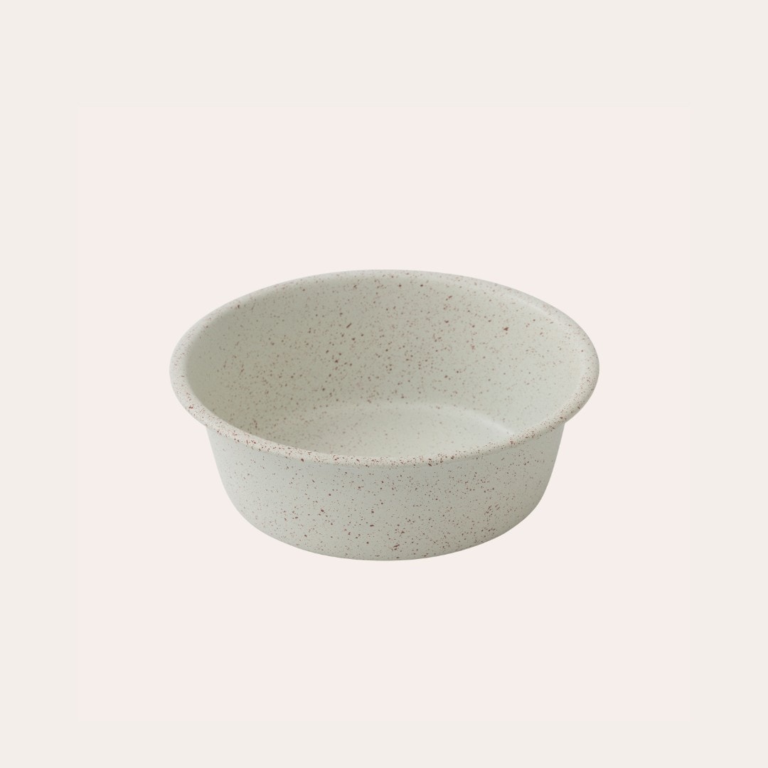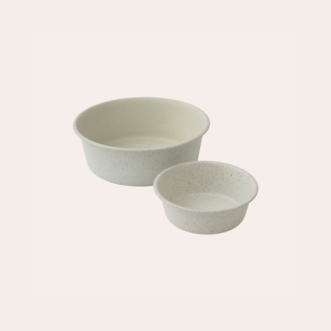 Hundskål i metall i spräckligt mönster med antiglid på botten så att den står stadigt på golvet. S 13,5 cm x 4,5 cm 470 ml, L 21 cm x 5 cm 1800 ml.