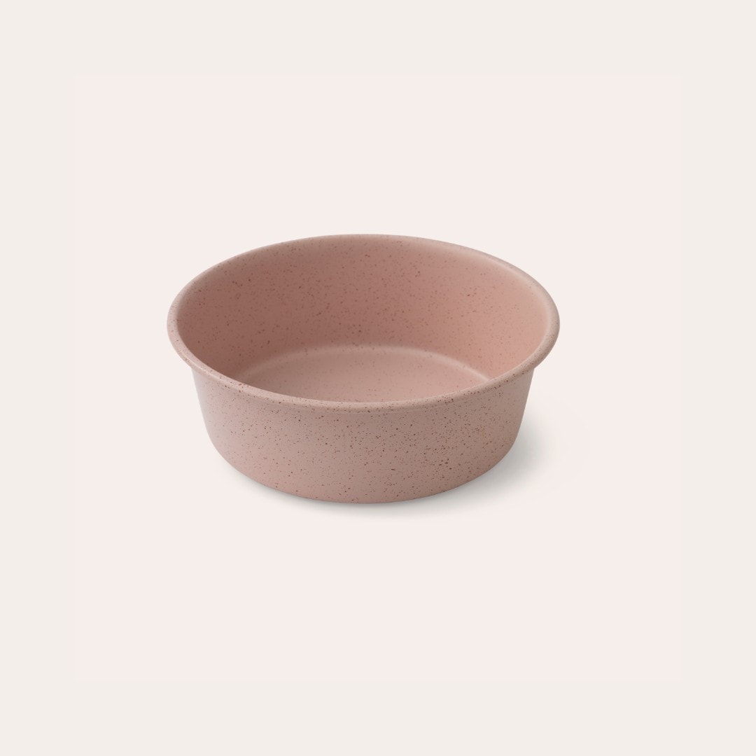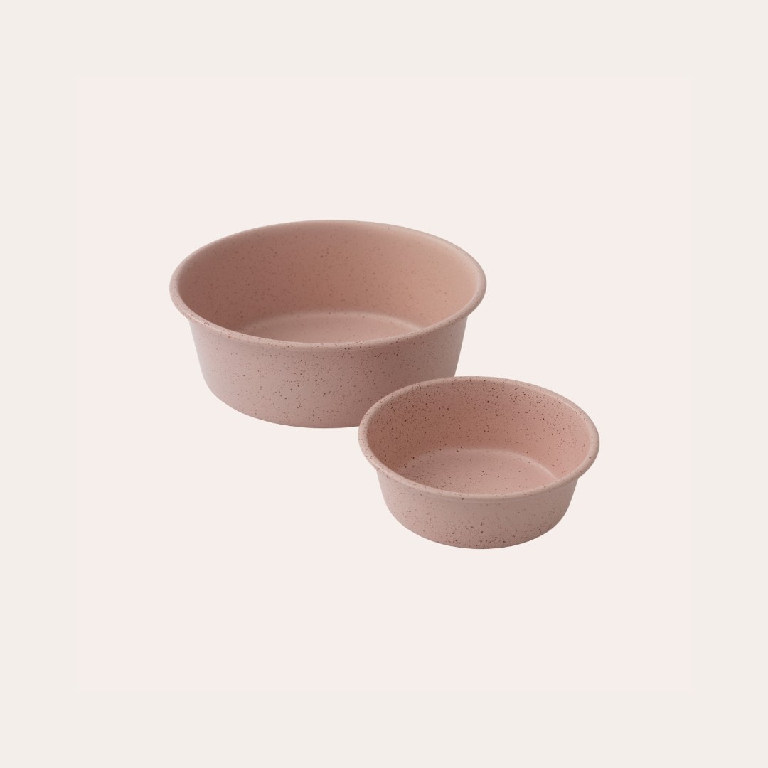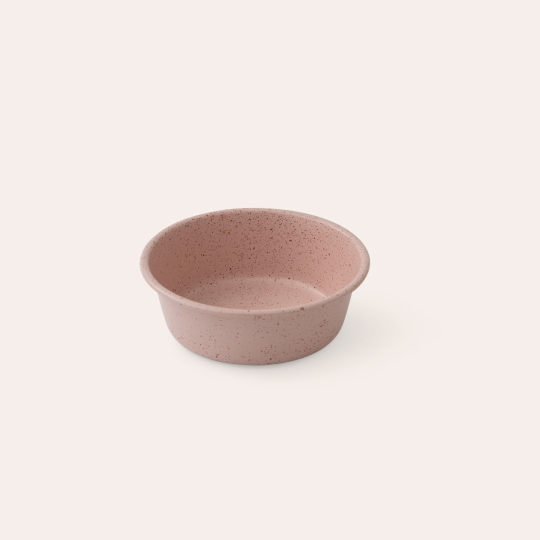 Hundskål i metall i spräckligt mönster med antiglid på botten så att den står stadigt på golvet. S 13,5 cm x 4,5 cm 470 ml, L 21 cm x 5 cm 1800 ml.
