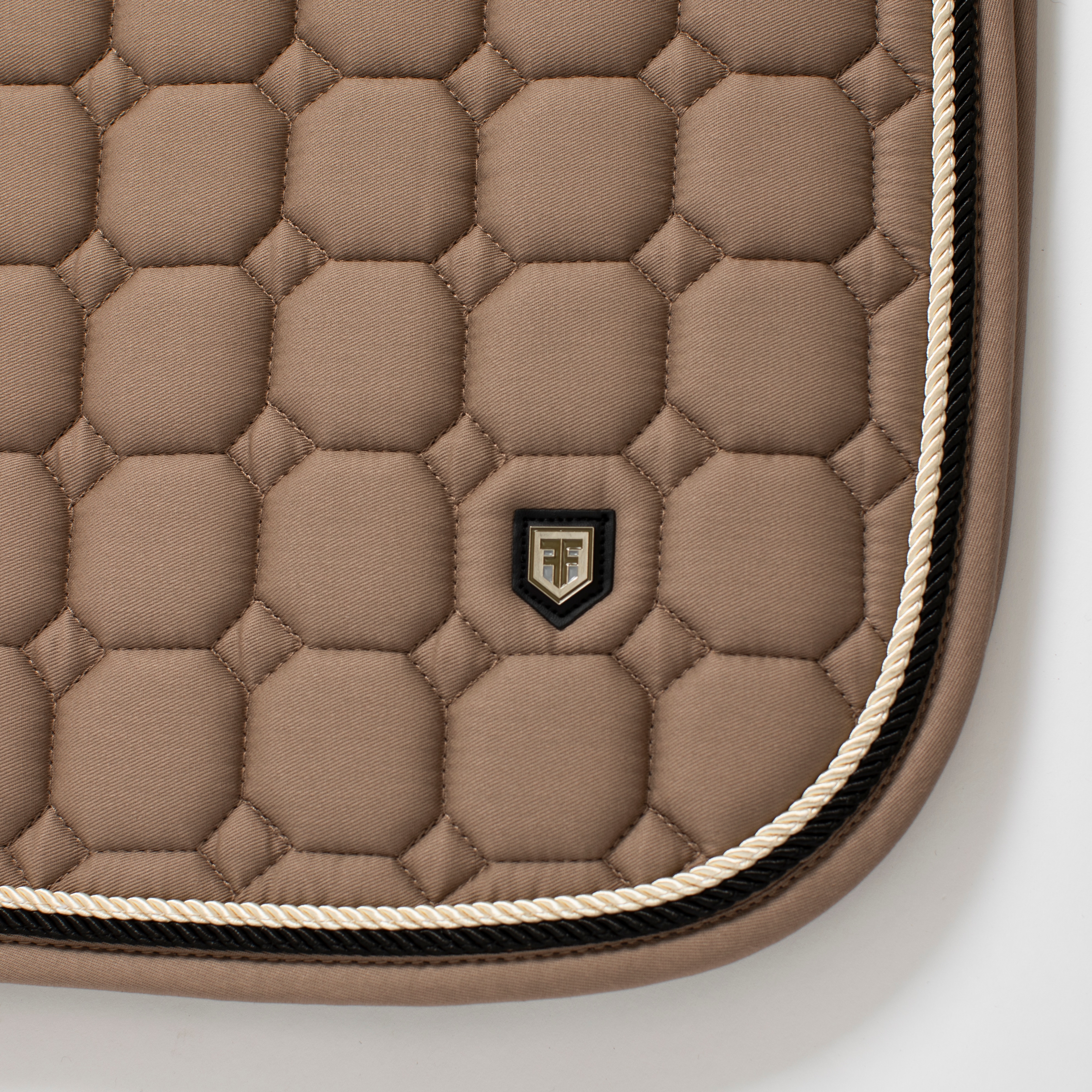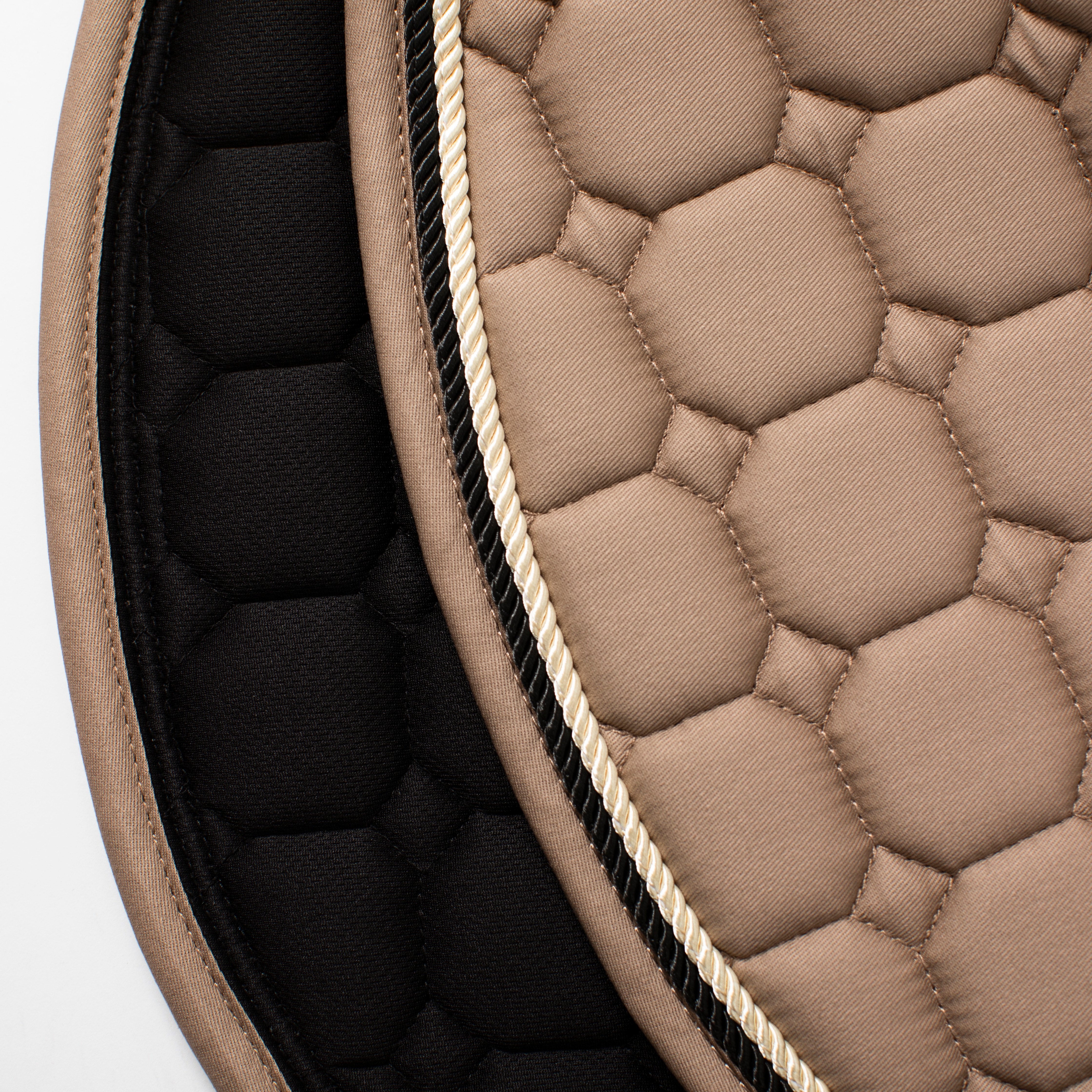 Quiltat schabrak med utsida i siltstark bomullstwill. Kraftig kombinationspadding i 300g polyfill + 1cm foam ger ett stadigt schabrak som håller formen och ligger på plats. Insida i 100% polyester funktionsmaterial som hjälper till att transportera bort fukt ifrån hästen. Teddyfodrat vid manken för att motverka skav samt panel i 3D mesh längst ryggraden för att ge ventilation. Extra förstärkt vid sadelgjorden för ökad slitstyrka och korta stroppar för fäste i sadelns d-ring gör att schabraket passar till de flesta sadlarna.