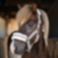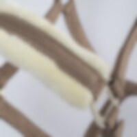 Grimma med mjuk minkfleece i nacke, nos och sidostycken. Ställbar på båda sidor av nacken och under nos. Mörkbeige grimma har roséfärgade spännen och marin har silverfärgade spännen.