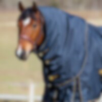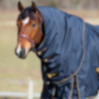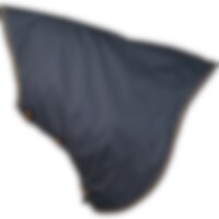 Fodrat halstäcke. Modell som täcker mer av bogen för att hålla hästen torr och varm även i riktigt ruskväder. Kardborreknäppning.