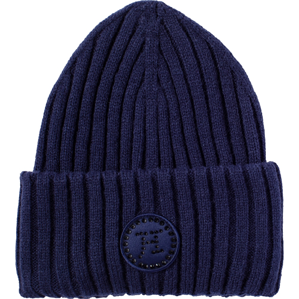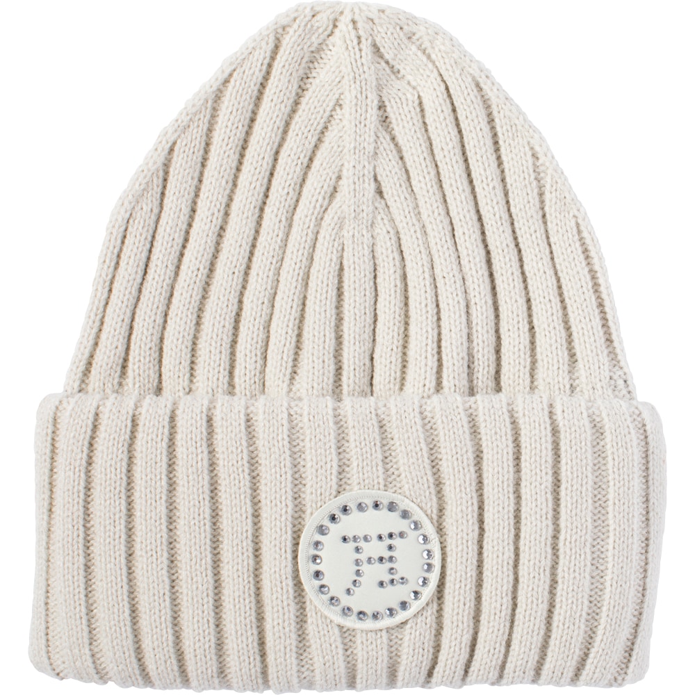Ribbstickad mössa med värmande fleece på insidan. Brett uppvik fint dekorerat med logomärke med strass.