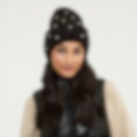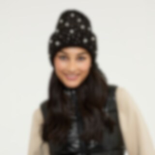 Ribbstickad mössa med dekorativa strasstenar och pärlor.