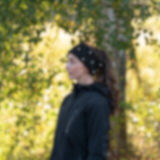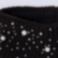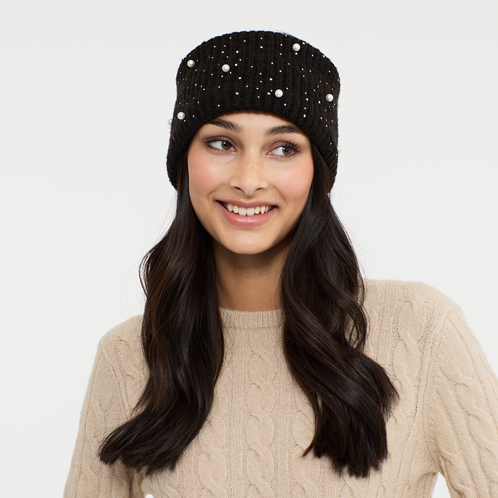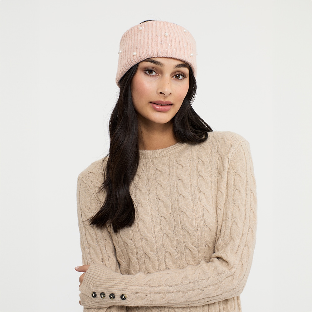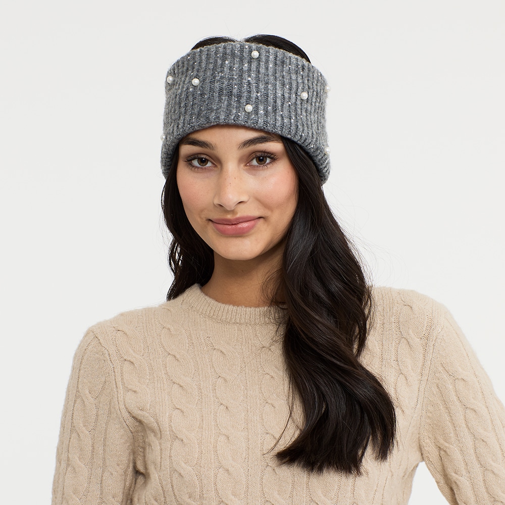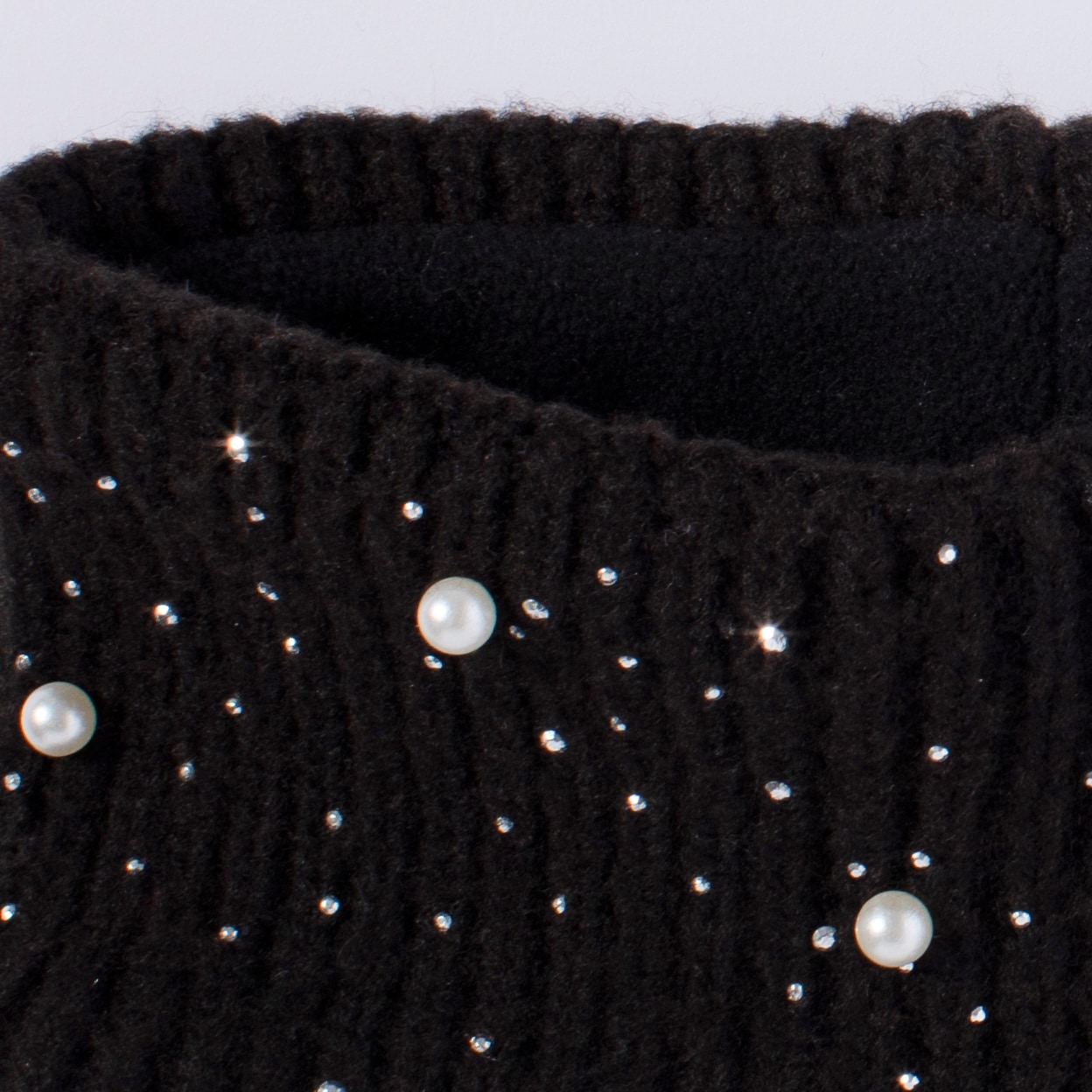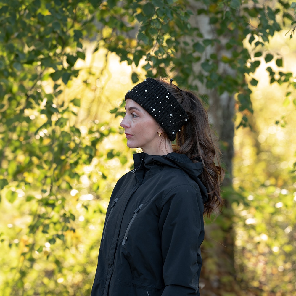 Ribbstickat pannband med mjukt fleecefoder. Dekorativa strasstenar och pärlor.