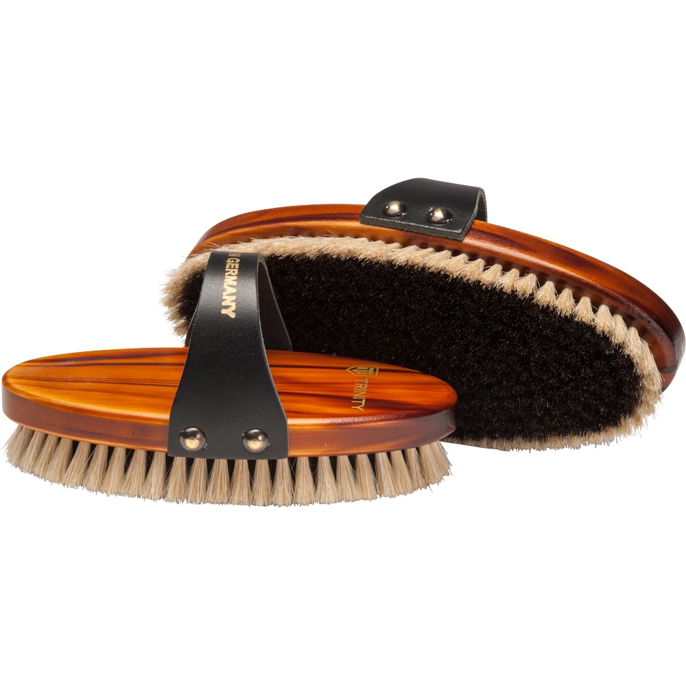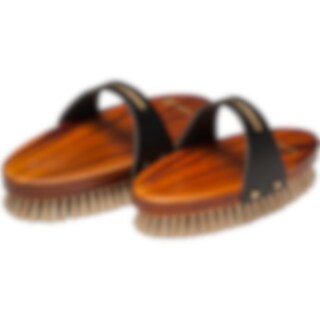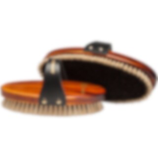 Tysktillverkad ryktborste med brunlaserad trärygg. Läderrem och tagelborst.