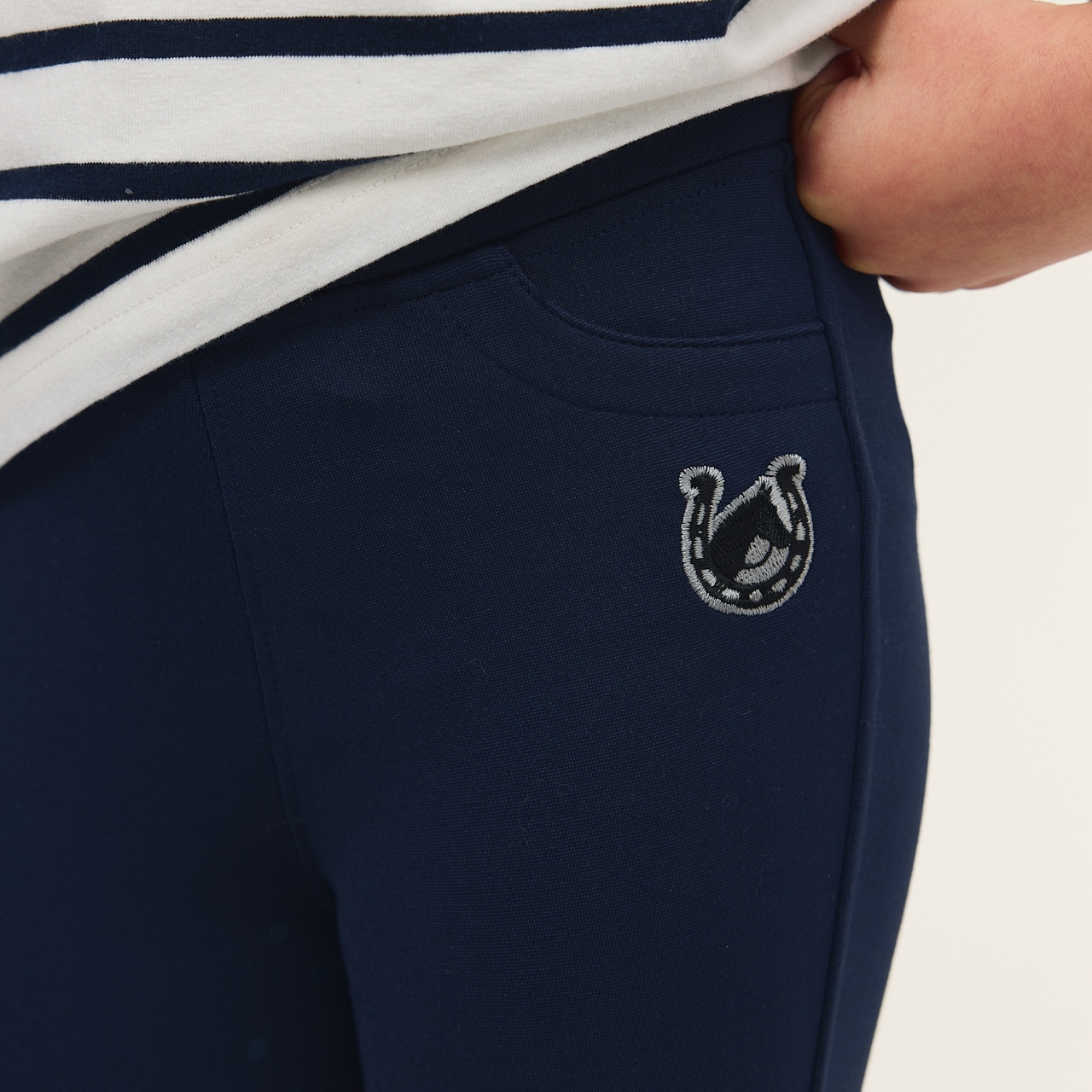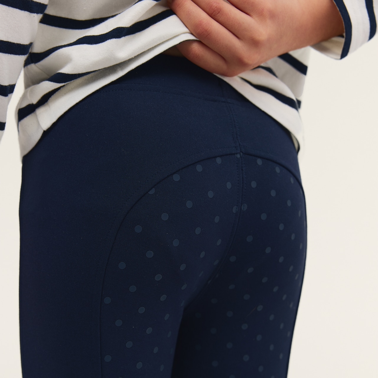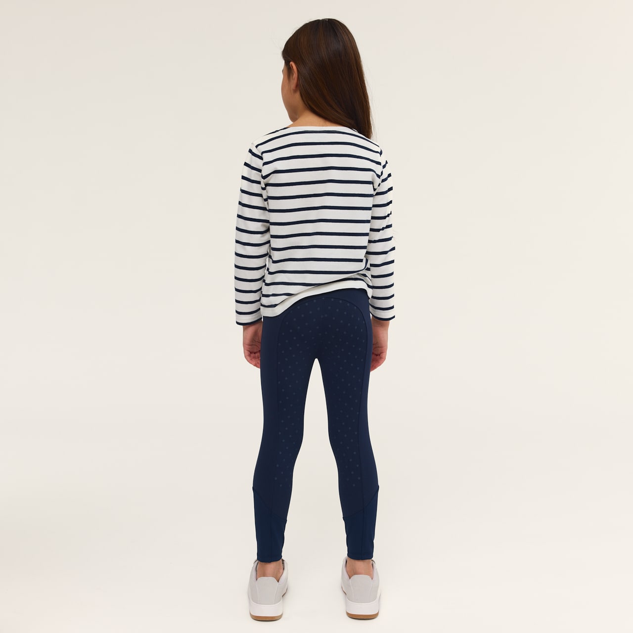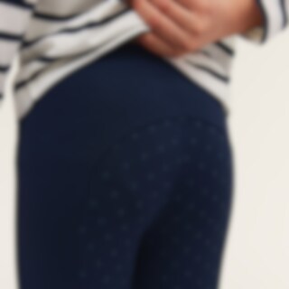 Söta ridleggings för de yngsta ryttarna. Sadelskuren, pull-on ridleggings i mjukt och stretchigt material. Helskodda med grip. Elastiskt midjeband med dragsko. Elastiska benslut.