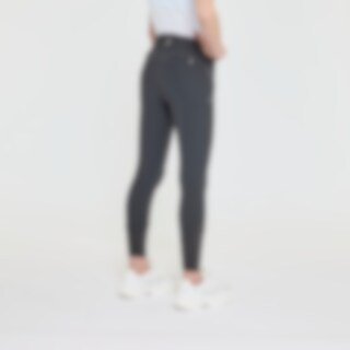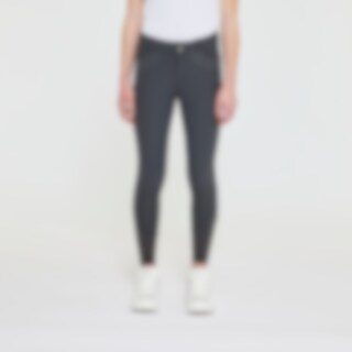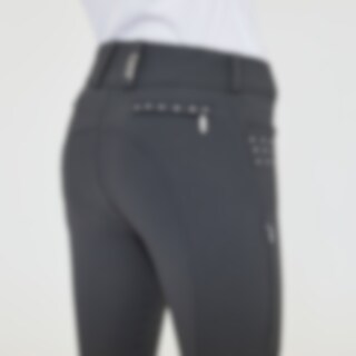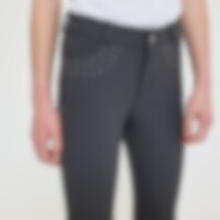 Vävd ridbyxa med sadelskärning i stretchigt funktionsmaterial. Formfast kvalitet som är slitstarkt, smutsavvisande och mycket bekväm att bära. Knäskodd med grip där även gripen fortsätter insida lår för optimlat fäste och stöd i sadeln utan att byxan är helskodd. Elastiska benslut. Normalhög midja med dubbel knäppning för att ridbyxan säkert ska sitta på plats och ge en ökad komfort. Två fickor fram och två dragkedjeförsedda fickor bak. Diskret dragkedjeförsedd mobilficka på utsida lår. Snygg detalj med strasstenar vid fickorna ger en elegant look. Något liten i passform, vi rekommenderar därför att du går upp en storlek.