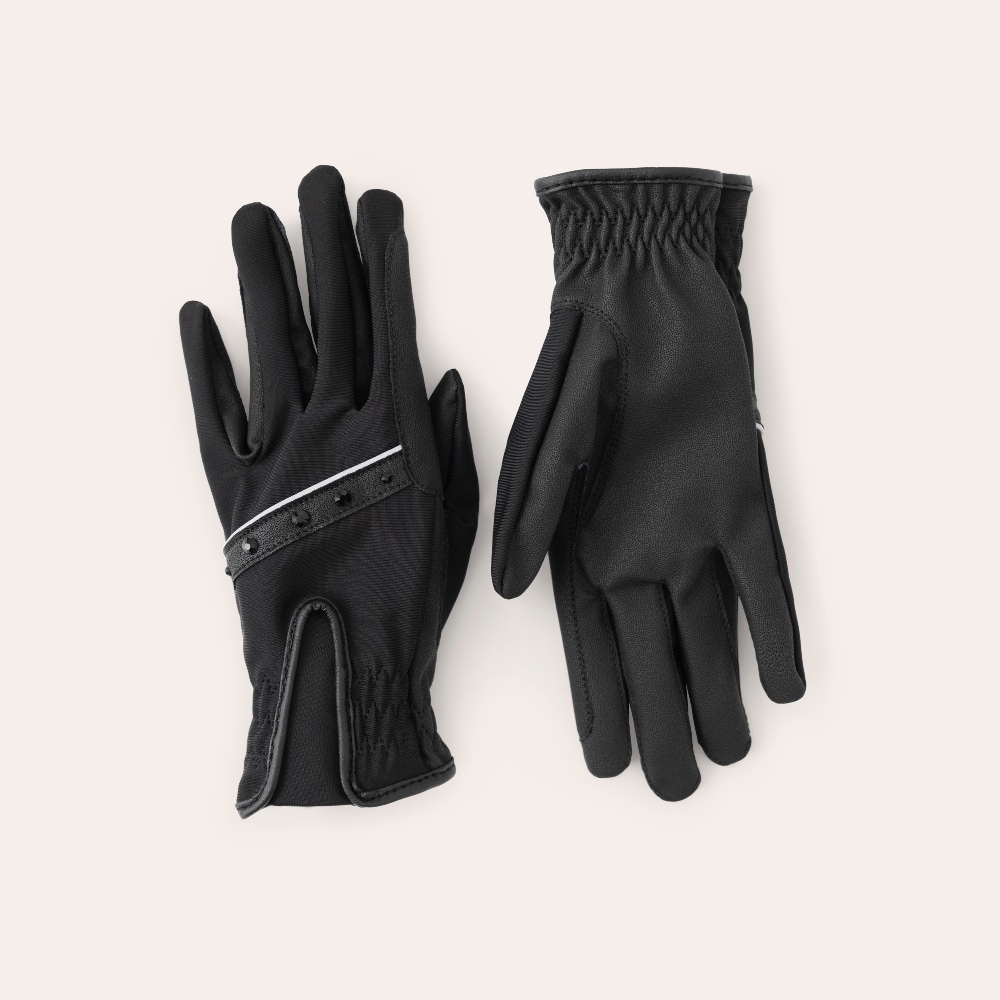 Klassisk ridhandske tillverkad i mjukt syntetmaterial som ger ett bra grepp om tygeln. Ovansida i stretchigt funktionsmaterial som ger en god rörlighet och ventilation. En nätt välsittande handske dekorerad med strasstenar.