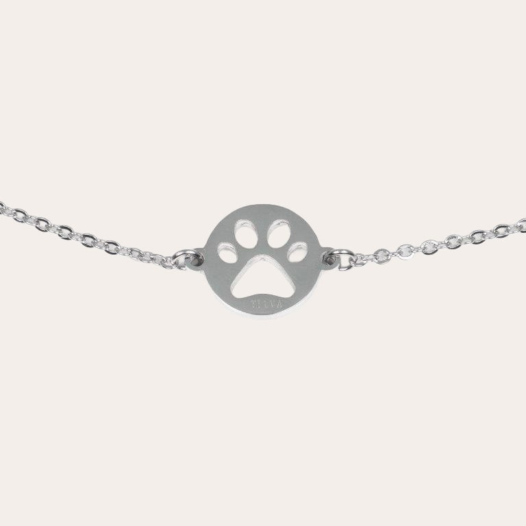 Armband av kirurgiskt stål, fritt från nickel & kobolt. Armbandets längd är 18-22cm. (justerbart i storlek genom en länk i ena änden.) Brickan med tass- avtrycket har måttet 12mm i diameter.