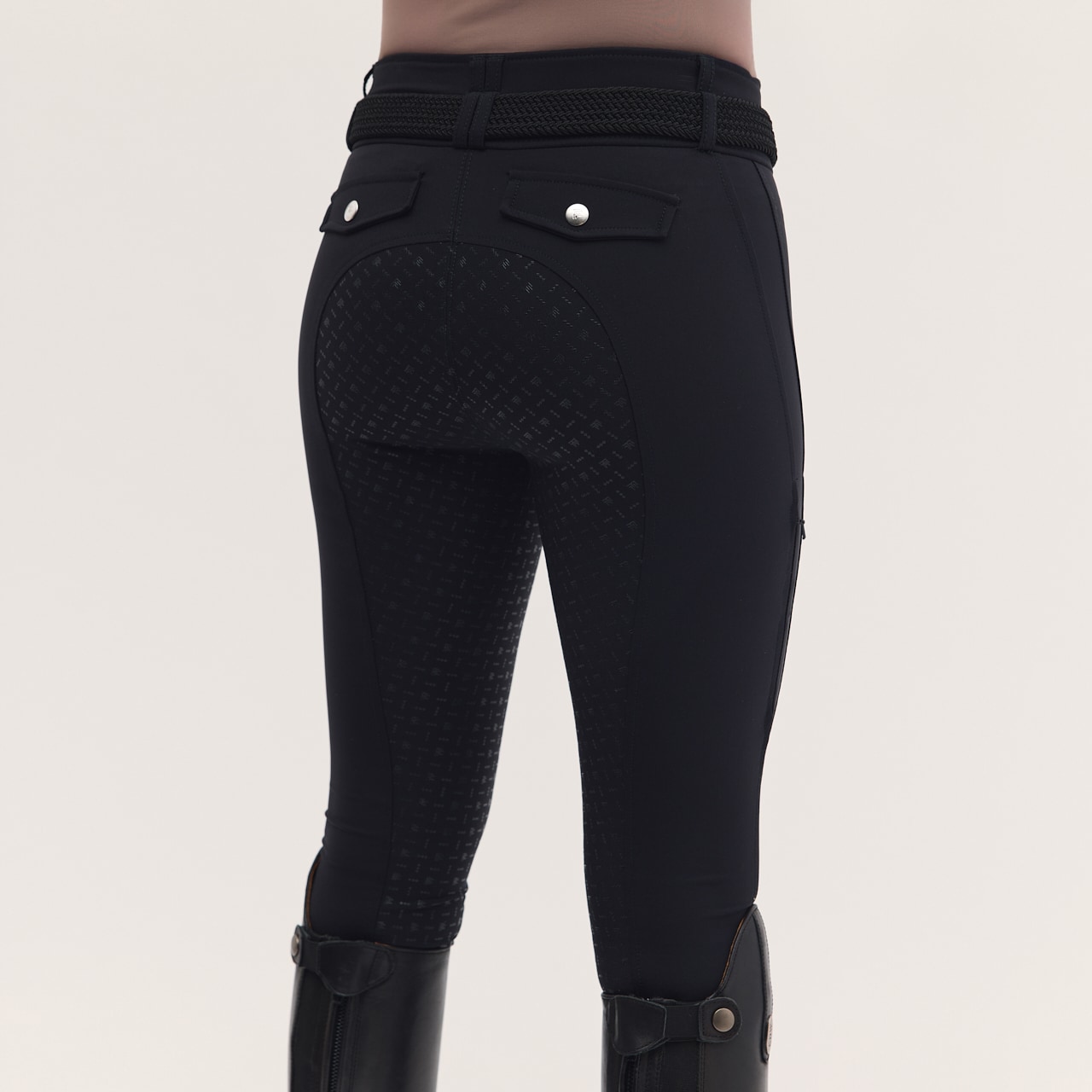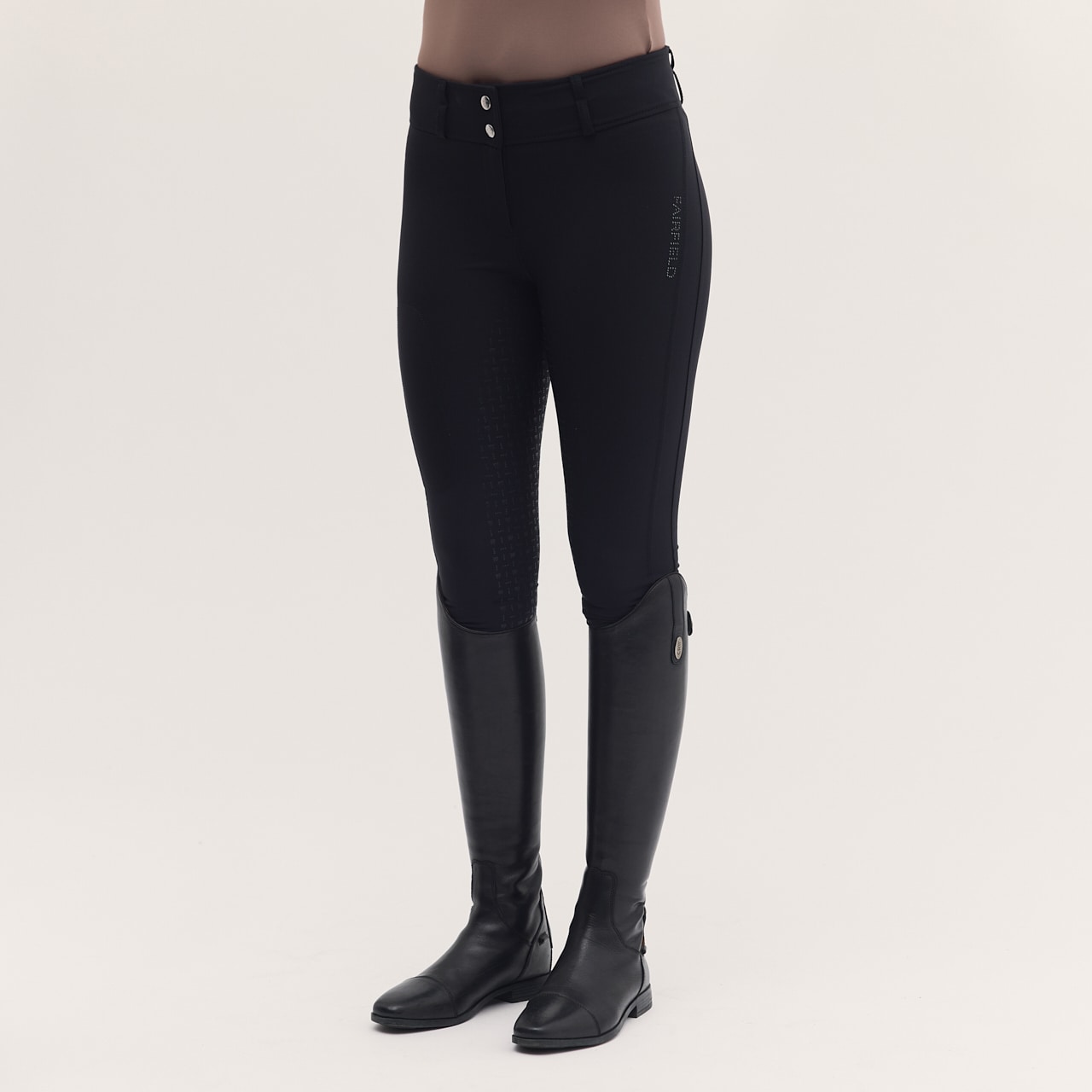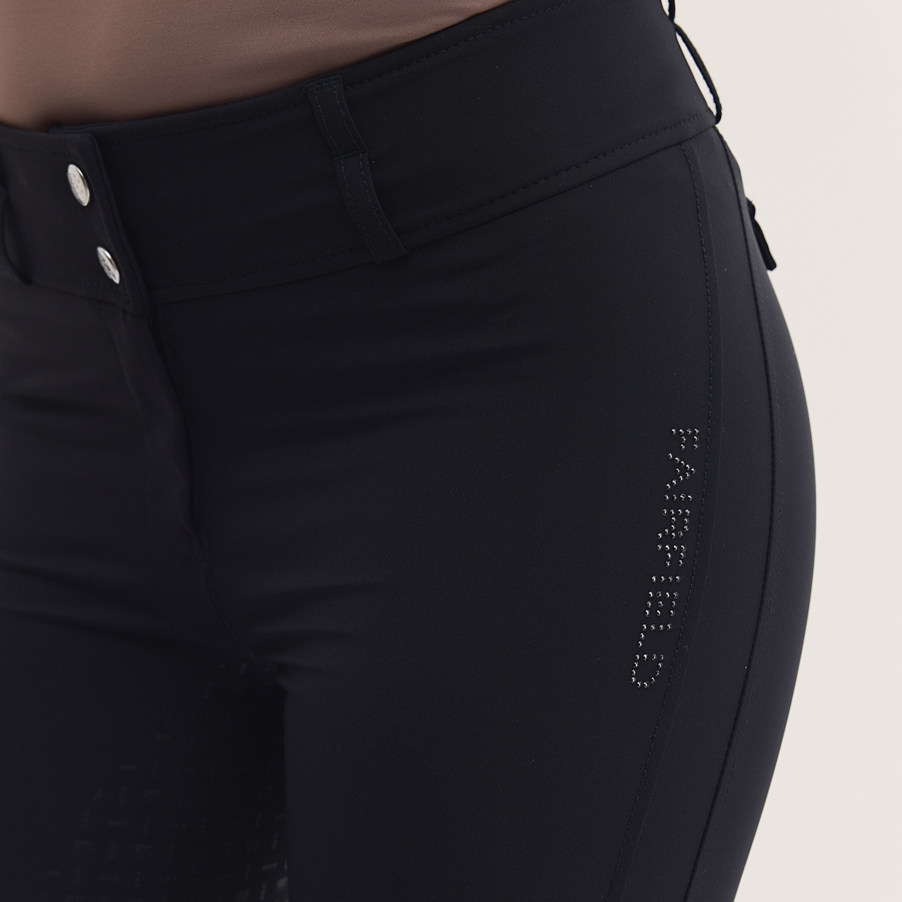 Ridbyxa i vävt snabbtorkande funktionsmaterial med hög andasfunktion. Det stretchiga materialet ger god följsamhet. Helskodda med grip som ger ett mjukt fäste i sadeln. Normalhög midja med dubbel knäppning för att ridbyxan säkert ska sitta på plats och ge