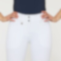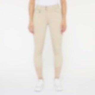 Stilren och tidlös ridbyxa med sadelskärning i stretchigt funktionsmaterial. Formfast kvalitet som är slitstark, lättskött och mycket bekväm att bära. Normalhög midja med dubbel knäppning för att ridbyxan ska sitta på plats och ge en ökad komfort. Linning med hällor. Knäskodda med PU grip som ger ett mjukt fäste. Två öppna fickor fram och elastiska benslut.