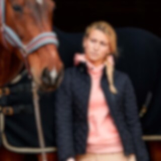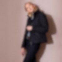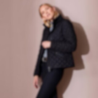 Kviltad jacka i figursydd modell med fast huva som går att gömma i kragen och försluts med dragkedja. Pälsimitation på insida krage. Vadderad med THERMOLITE®. Tre dragkedjeförsedda fickor fram samt en innerficka.