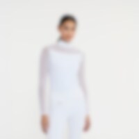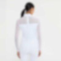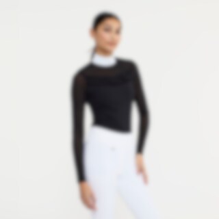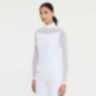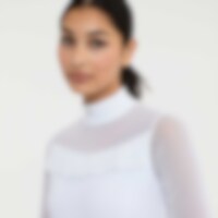 Långärmad tävlingstopp med figurnära passform i stretchigt funktionsmaterial. Mjukt och stretchigt meshtyg i ärm och ovandel som ger en sval känsla. Dold dragkedja bak. Volangdetalj framtill och tävlingskrage med strassdetalj.