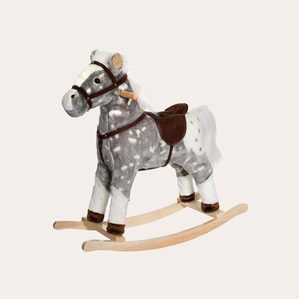 Gunghästen Pricken är en mjuk kvalitetsgunghäst att galoppera iväg på äventyr med. Hästen ger ifrån sig gnägg- och galoppljud när man trycker på höger och vänster öra. Smarta handtag som är fästa på varsin sida av huvudet gör att barnen enkelt kan hålla i sig. Gunghästen är också utrustad med tippsäkra medar. Maxvikt: 55 kg. Kräver 2 x AA-batterier (ingår ej). Från 3 år, godkänd enligt CE & EN71.Vänligen ta bort alla etiketter, plastdelar och snören innan du ger leksaken till ett barn.