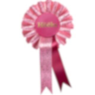 Prisrosett i käpphäst-storlek med hake på baksidan. Guldtryck på kransen och ett band. Total längd: 21 cm, bredd: 11 cm.