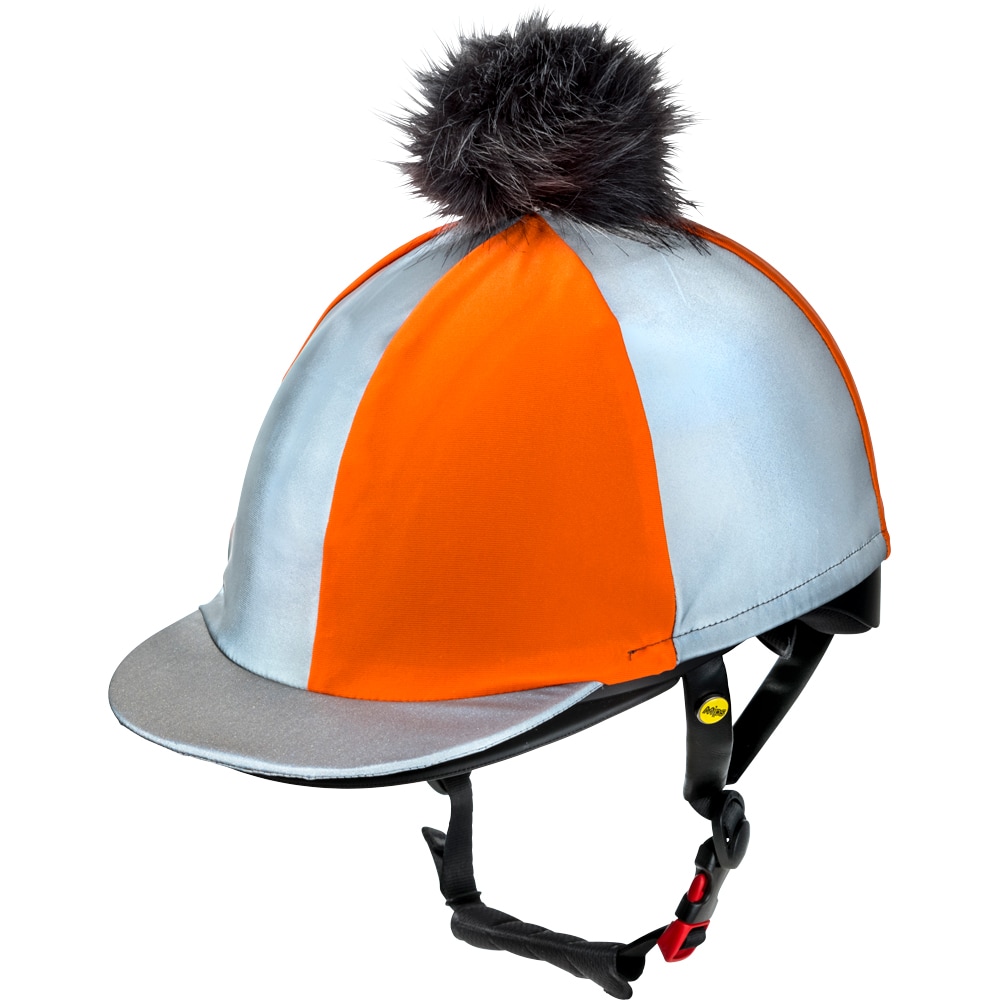 Hjälmöverdrag i stretchig lycra som passar de flesta hjälmar. Extra lämplig till jockeyhjälmar. Varannan sektion, med reflextyg för ökad synlighet i mörker och fluorescerande färger för extra synlighet i skymningsljus. Med skärm och avtagbar tofs i fuskpäls.