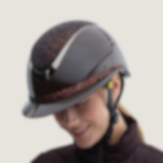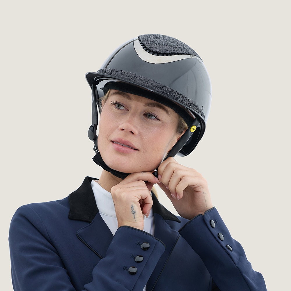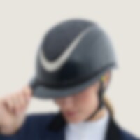 Ridhjälm i högblank metallicfinish, dekorerad centerplatta samt dekorationsdetalj ovanför skärmen. Låg vikt samt ventilation fram och bak ger en hjälm som är bekväm under hela ridpasset. Justerbar med skruv baktill för goda inpassnings möjligheter. Trepun