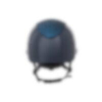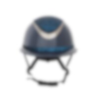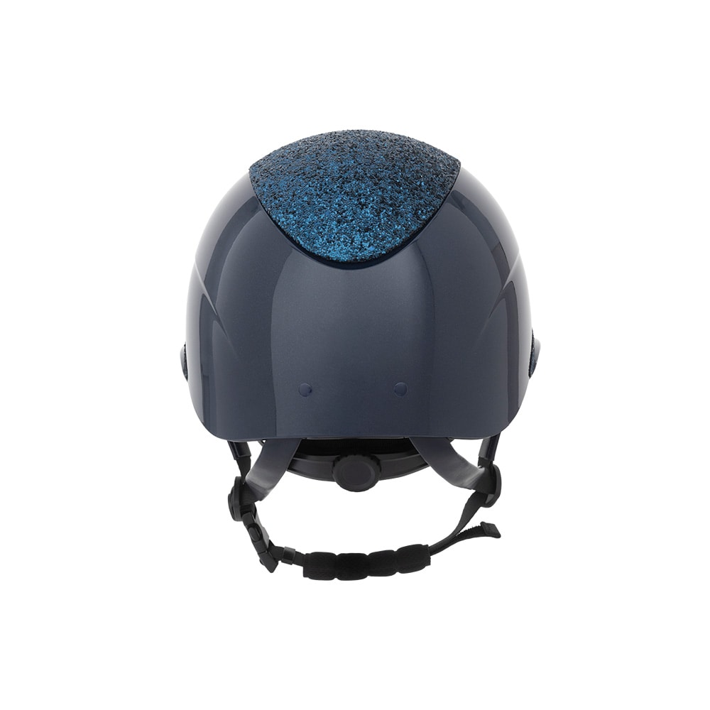Ridhjälm i högblank metallicfinish, dekorerad centerplatta samt dekorationsdetalj ovanför skärmen. Låg vikt samt ventilation fram och bak ger en hjälm som är bekväm under hela ridpasset. Justerbar med skruv baktill för goda inpassnings möjligheter. Trepun