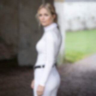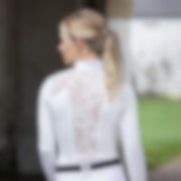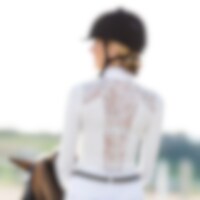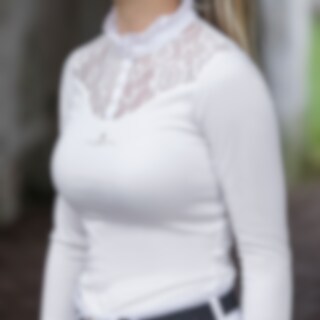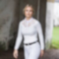 Långärmad tävlingstopp tillverkad i mjukt, stretchigt funktionsmaterial. Eleganta detaljer med spets över okparti och rygg. Kråskrage prydd med dekorativ knapp. Öppning fram med guldfärgade tryckknappar. Logo tryck på bröstet i guld.