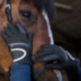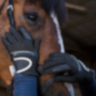 Ridhandske i smidigt syntetmaterial med ovandel i mjuk mesh. Kontrastpiping i silver. Ridgrepp i silicon.