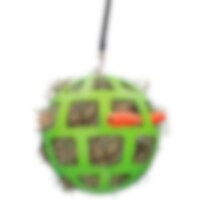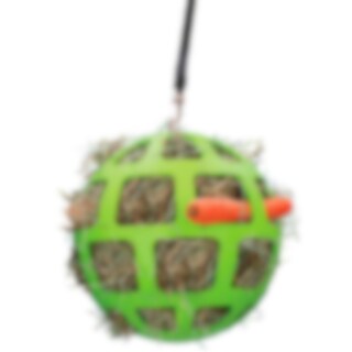 Fyll bollen med hö och t.ex morötter så har din häst något att göra en lång stund. Den mjuka bollen är gjord i naturgummi och är lätt att göra ren. Hängs lätt upp med det medföljande repet. 20 cm.
