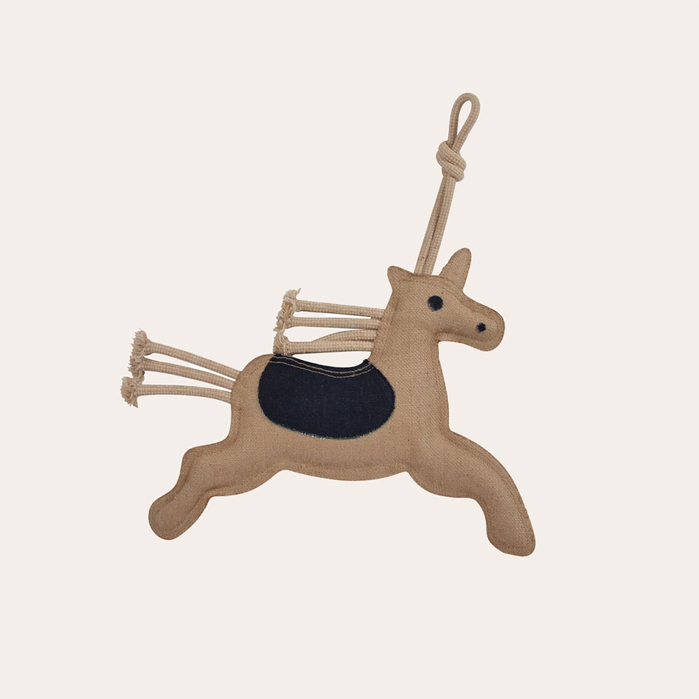 Leksak till häst. Enhörning tillverkad av jute. Optimal för hästar som lätt blir rastlösa i boxen, då denna kan hjälpa till att sysselsätta hästen och motverka tristess. Enkel att hänga upp.